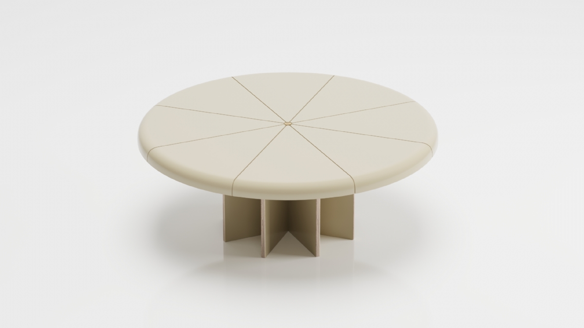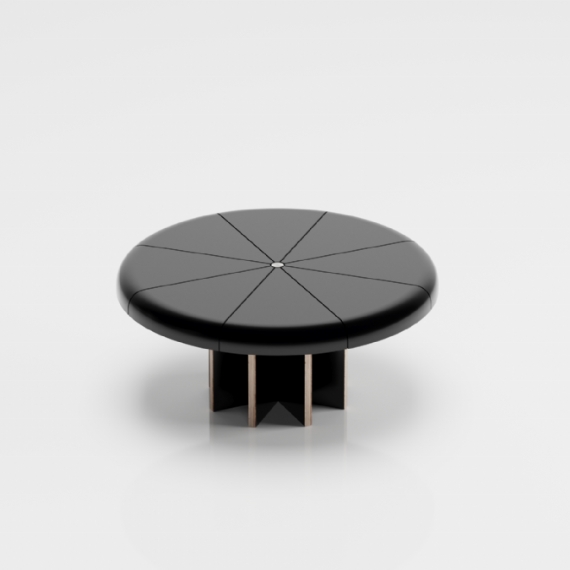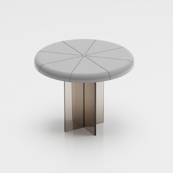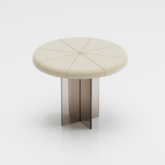 The top surface is made of 1st-grade MDF with a lacquered finish. There is a stainless steel button at the center of the table. The legs are available in imported plywood or imported colored glass options.